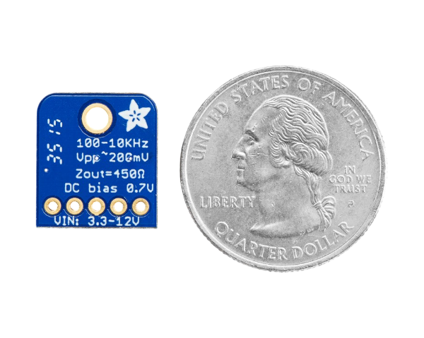 Using it is simple: connect GND to ground, Vin to 3.3-5VDC. For the best performance, use the “quietest” supply available (on an Arduino, this would be the 3.3V supply). The audio waveform will come out of the DC pin. The output will have a DC bias of 0.67V so when its perfectly quiet that’s what you’ll read, there’s a little drift. If the audio equipment you’re using requires AC coupled audio, you can grab the signal out of the AC pin, which has a 10uF capacitor in series.