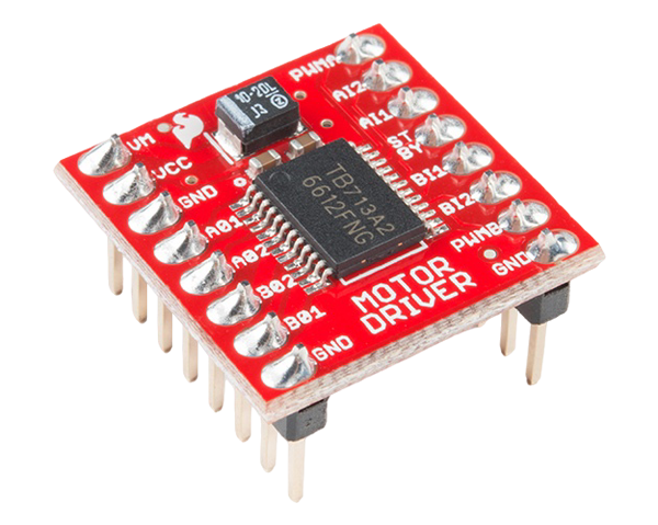 The TB6612FNG motor driver can control up to two DC motors at a constant current of 1.2A (3.2A peak). Two input signals (IN1 and IN2) can be used to control the motor in one of four function modes – CW, CCW, short-brake, and stop. The two motor outputs (A and B) can be separately controlled, the speed of each motor is controlled via a PWM input signal with a frequency up to 100kHz. The STBY pin should be pulled high to take the motor out of standby mode.